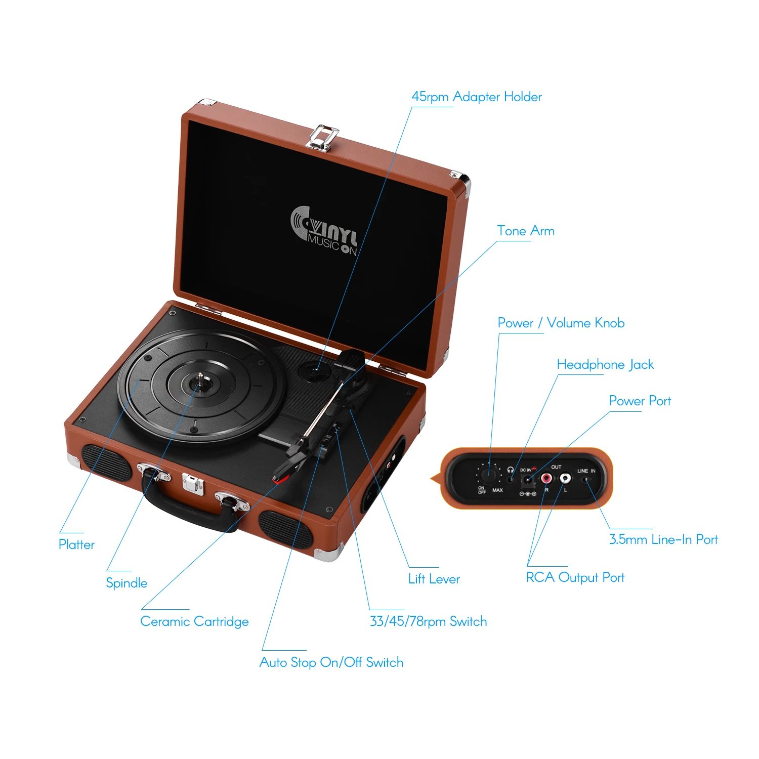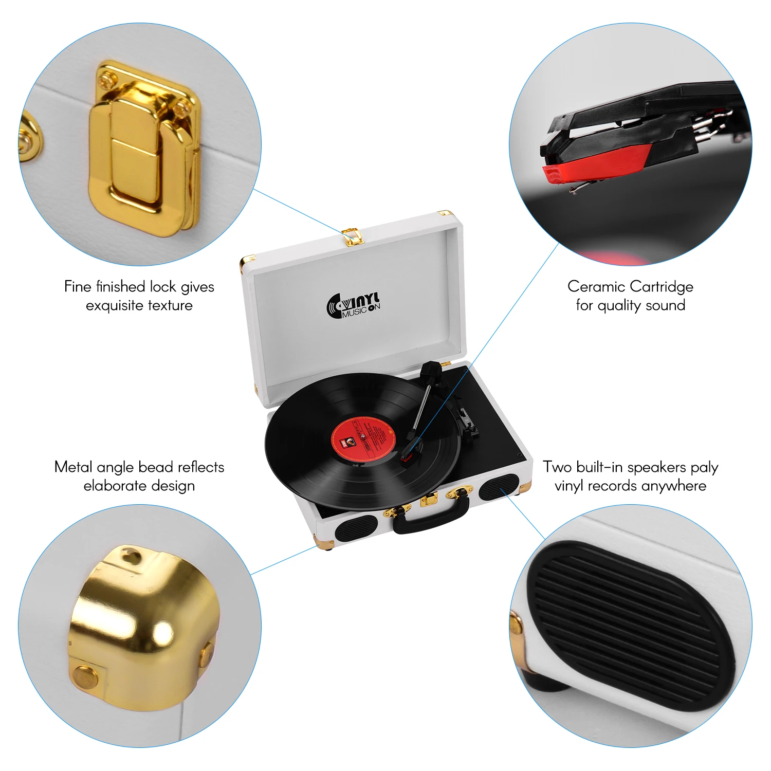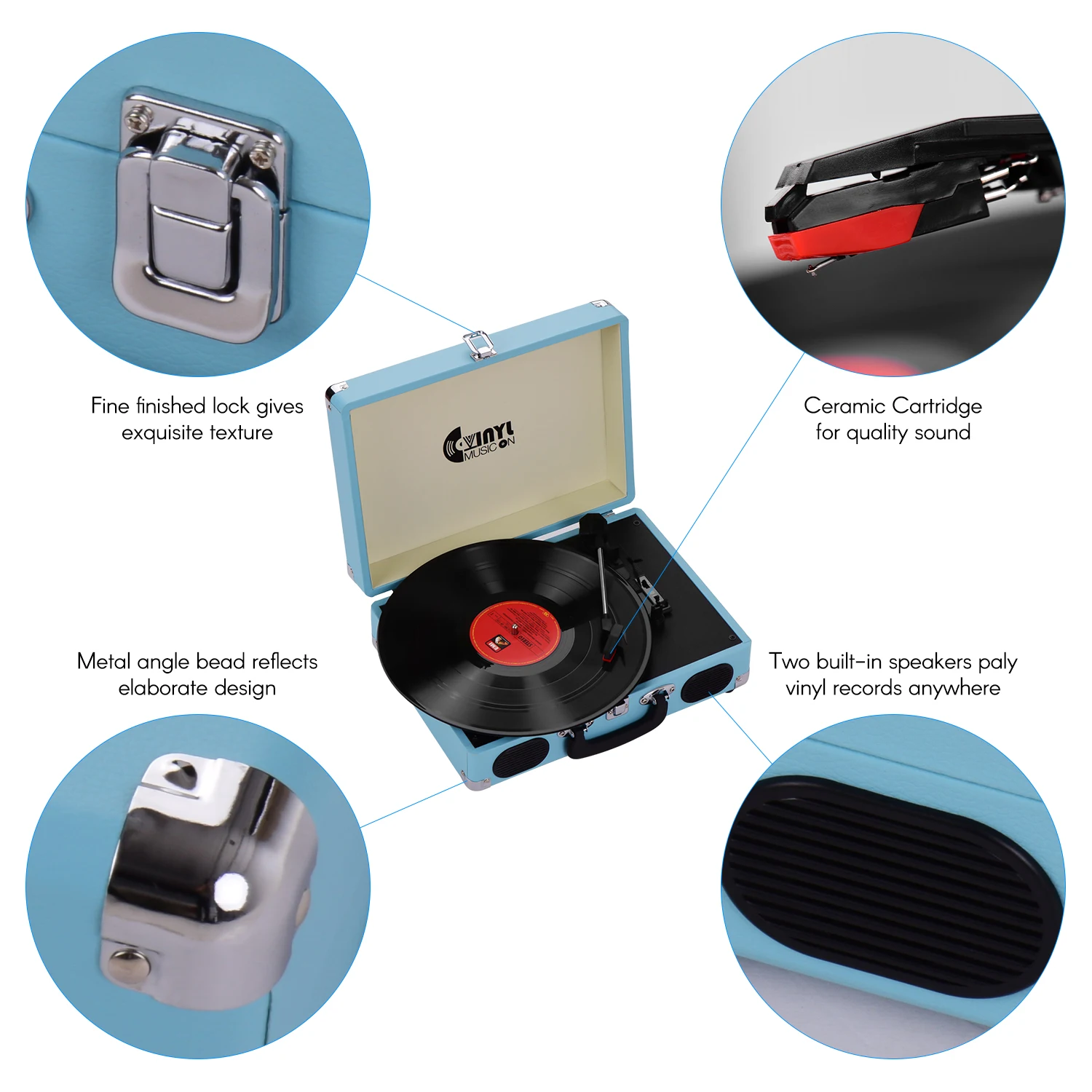 Винтажный дизайн даН для проигрывателя виниловых дисков Brifecase, что делает Проигрыватель виниловых дисков классическим и портативным.