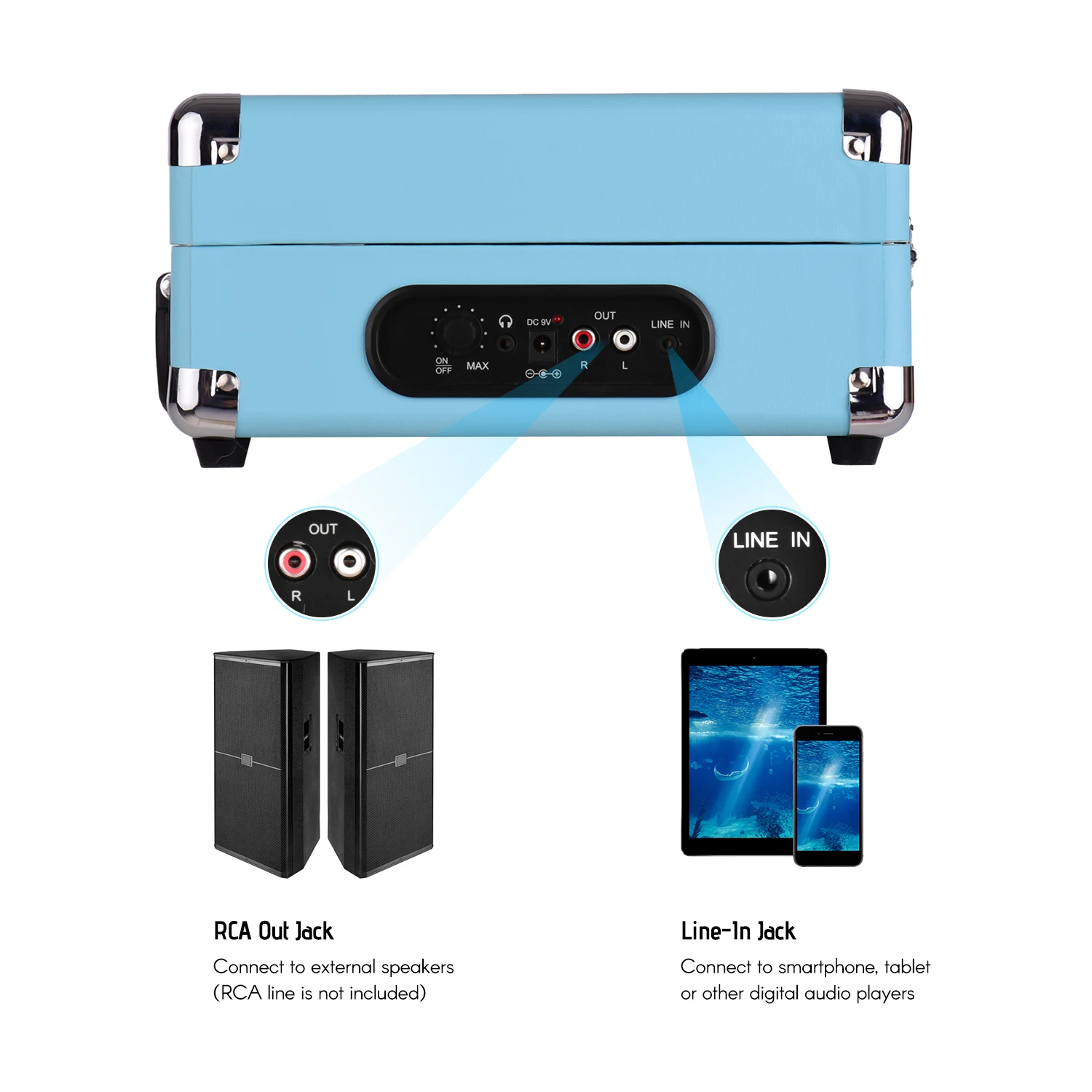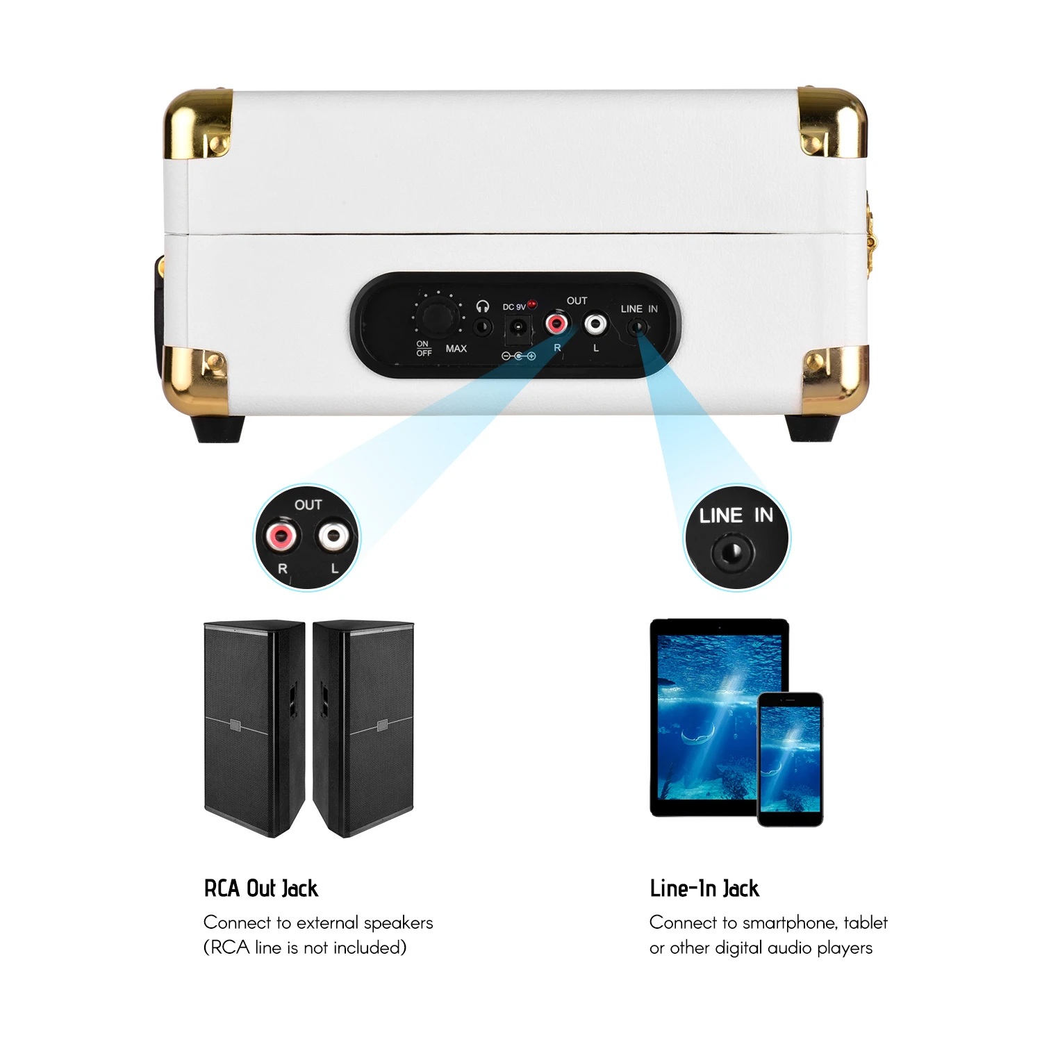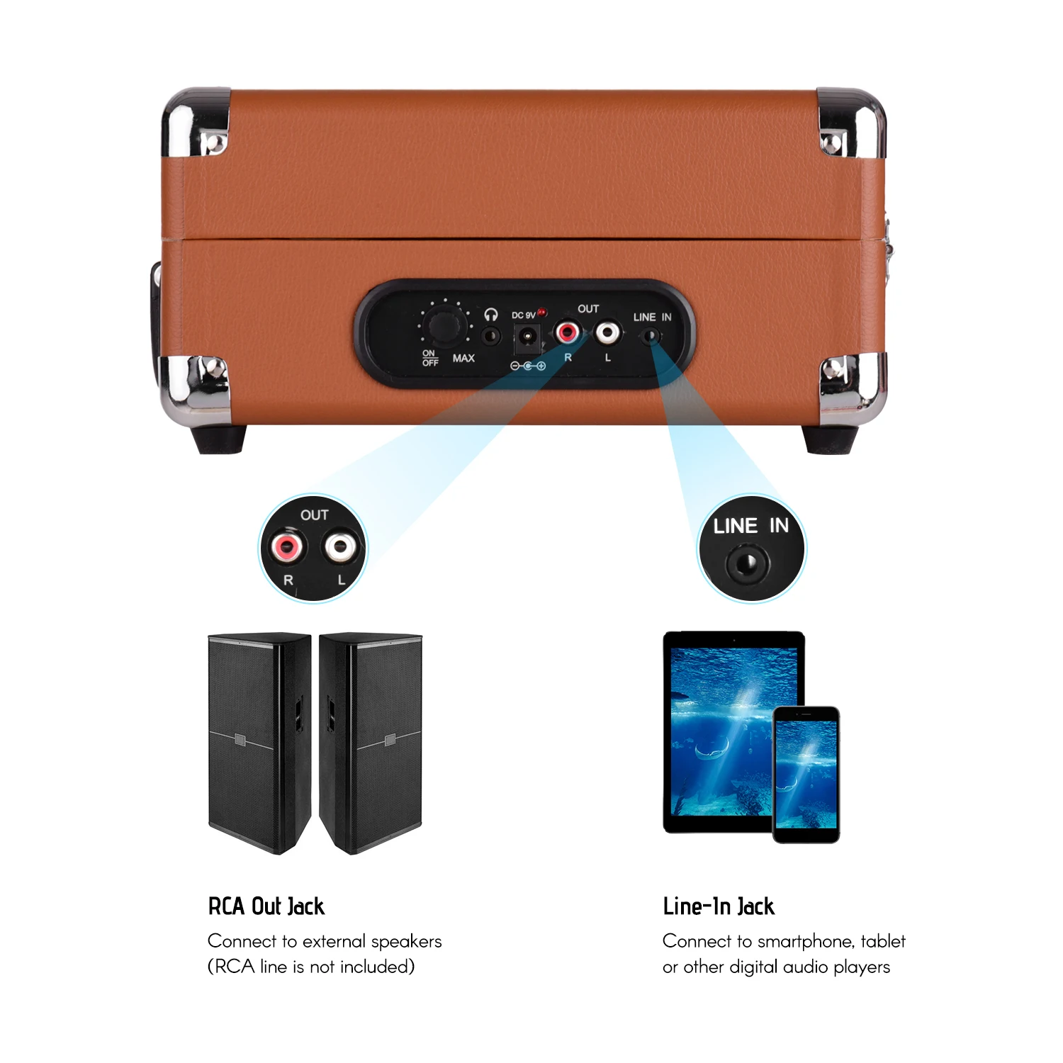 Этот проигрыватель виниловых пластинок может использоваться в качестве источника воспроизведения, подключаемого к вашей собственной акустической системе через линию RCA, и дает вам ощущение погружения из виниловых пластинок.