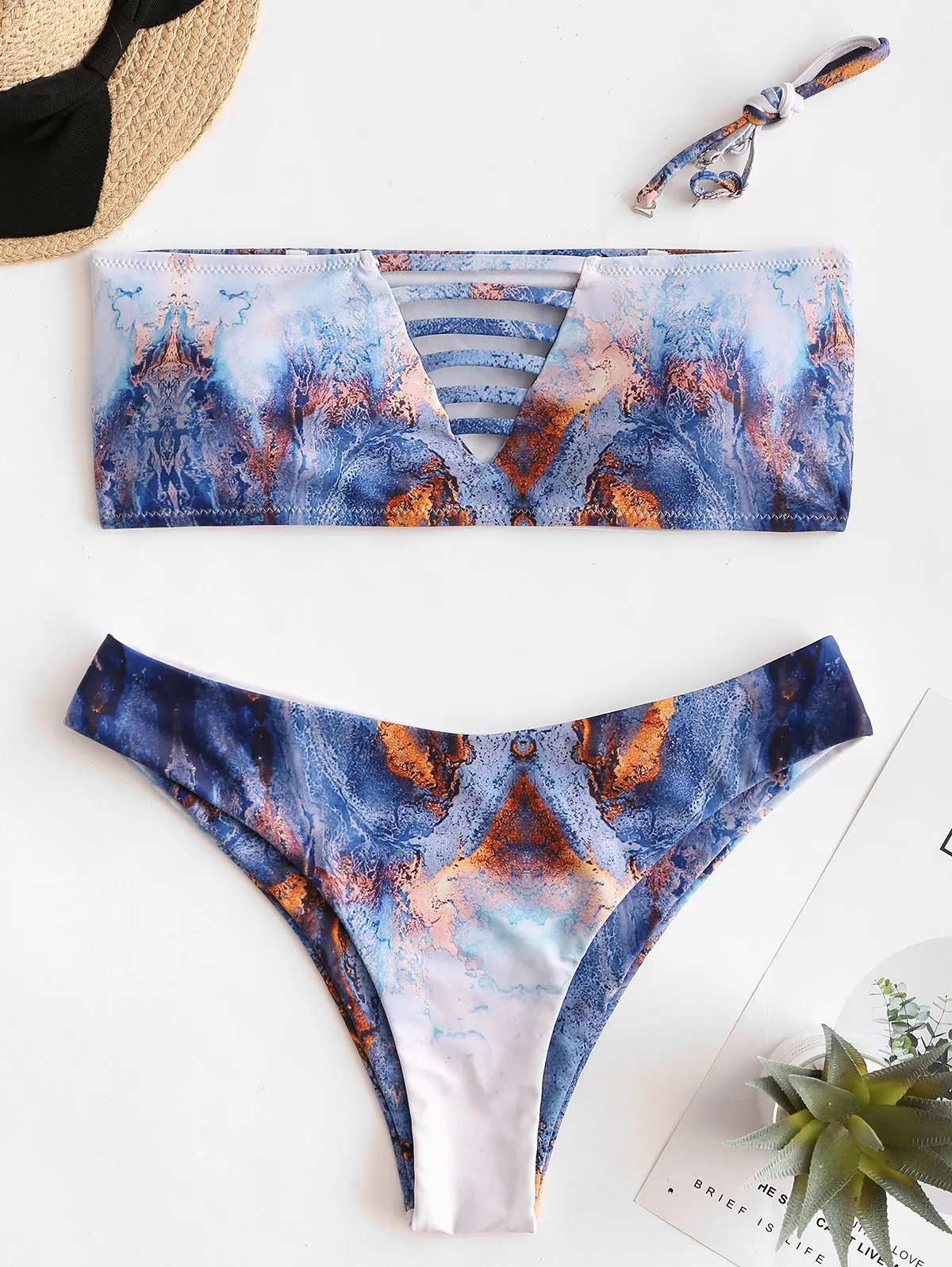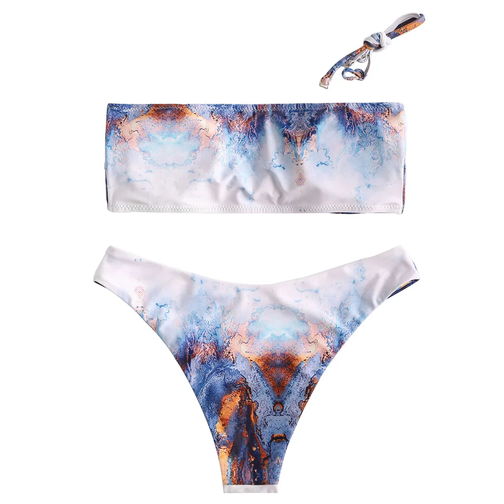 Выделитесь из толпы в этом уникальном бикини с мраморным принтом. Элегантный топ-бандо со съемными лямками и ремнями по бокам в сочетании с классическими брюками, которые сидят на талии со съемным покрытием сзади.