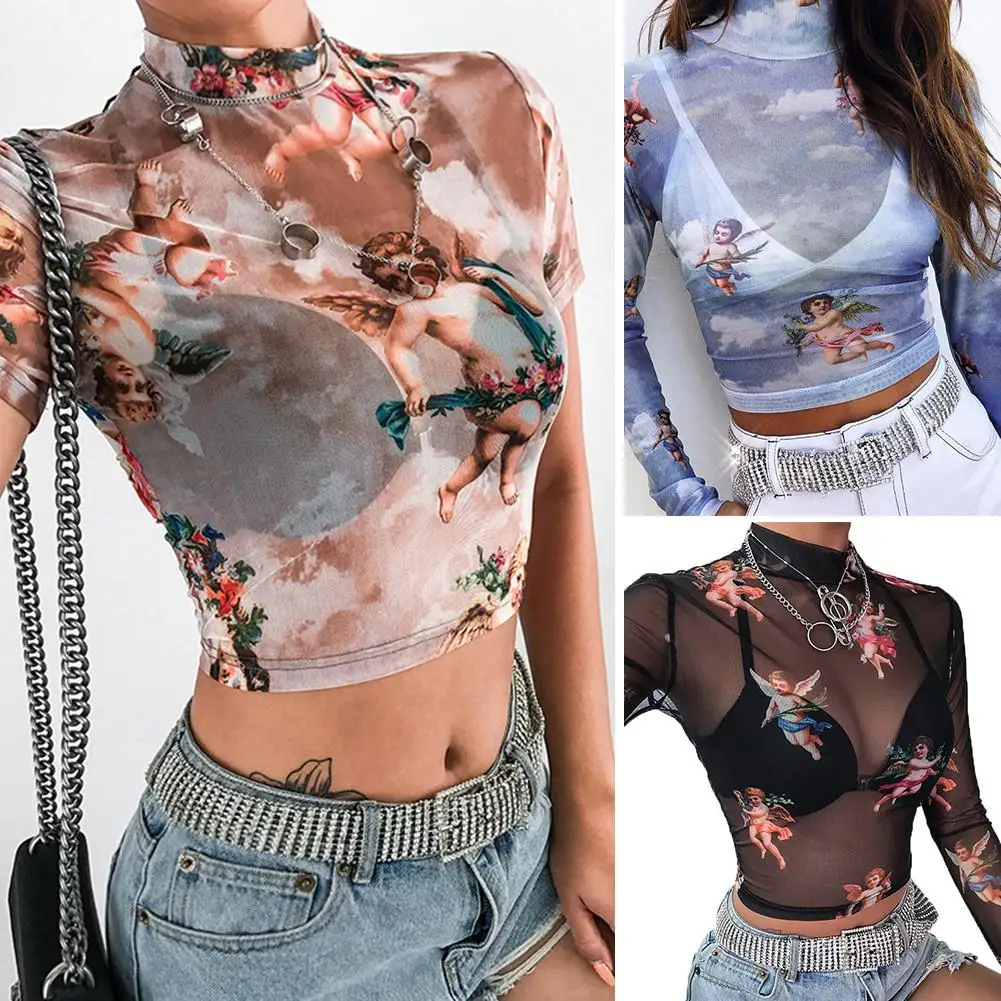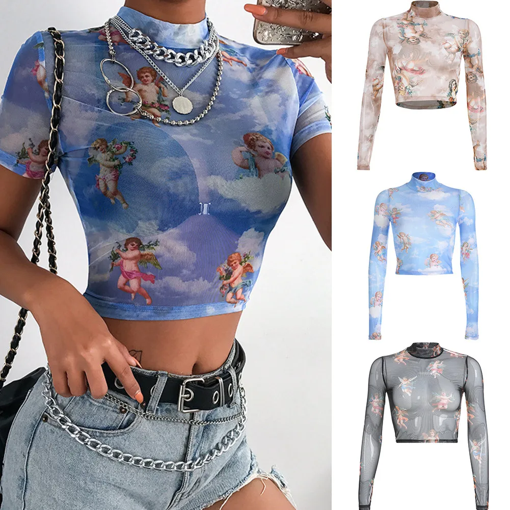 Особенности: принт ангела, прозрачный, приталенный, укороченный топ