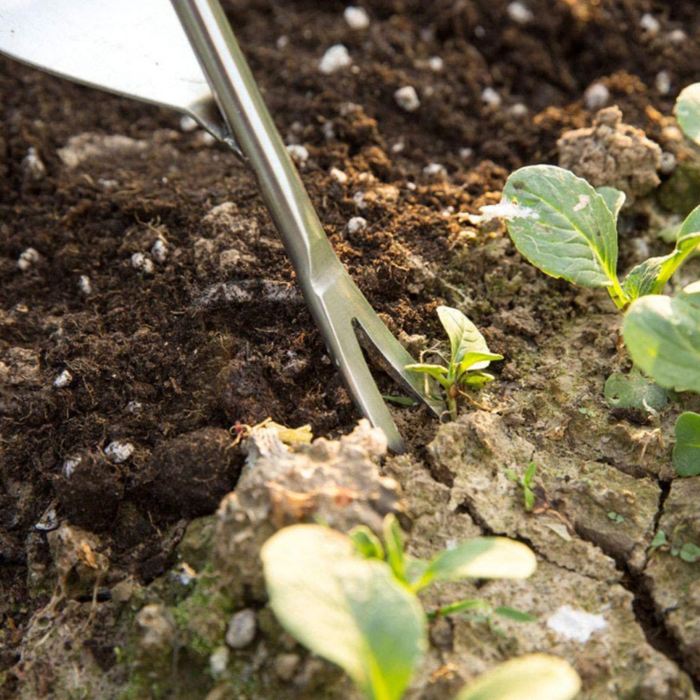 * 2. Наш компактный инструмент для прополки оснащен изогнутой, левочной базой, которая сидит на земле, пока вы наклоняете сильные, острые вилки в почву, чтобы копать вокруг основания корня.