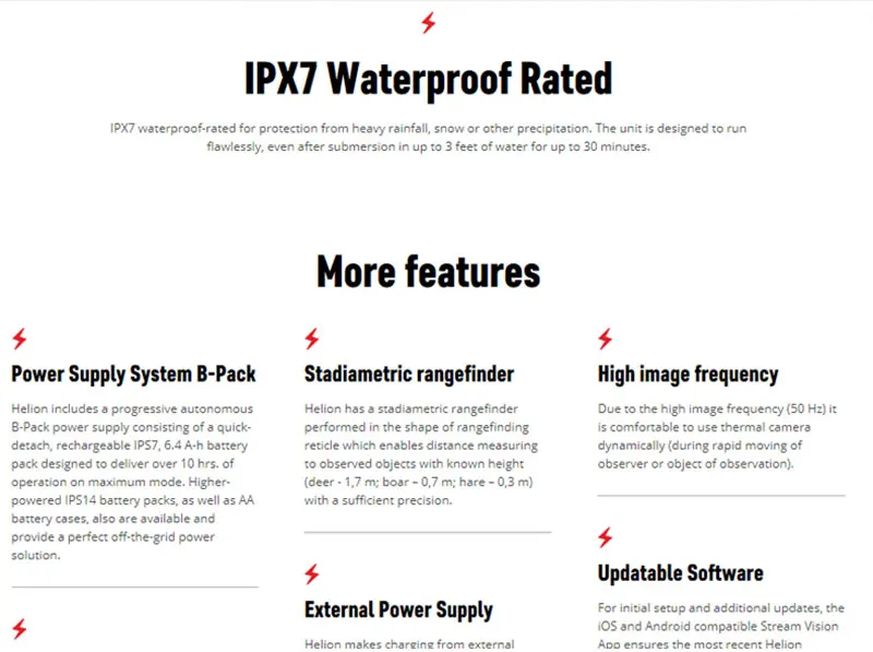 Дисплей-офф Wenn die Beobachtung kurzfristig gestoppt werden soll, kann der Benutzer die Funktion des Abschalten des Displays (в режиме ожидания) aktivieren. Diese Funktion verhindert zum Beispiel die Demaskierung des Anwenders, durch das Restlicht US dem Okular. (Das Display ist abgeschaltet, wyehrend alle anderen System weiter funktionieren. Um das gerйt zu aktivieren braucht man nur das Display - kurzer Tastendruck, kaum Wartezeit - wieder einzuschalten). Абсолют wasserdicht Helhelion entsprechen der IPX7 Feuchtigkeitsschutzklasse (nach dem стандарт IEC 60529). Das bedeutet, dass die geräbei jeder Niederschlagsmenge betrieben, sogar kurzfristig ins Wasser eingetaucht werden kongnen. Integrierter Videorekorder Die Wärmebildgeräte Helion sind mit einem Rekorder ausgestattet, der Photo- und Videoaufnahme hoher auflёsung wйhrend der Beobachtung ermumoglicht. Die auf der Speicherkarte gespeicherten Dateien (фото и видео) kongnen auf den PC, per Kabel oder через Wi-Fi ubertragen werden.