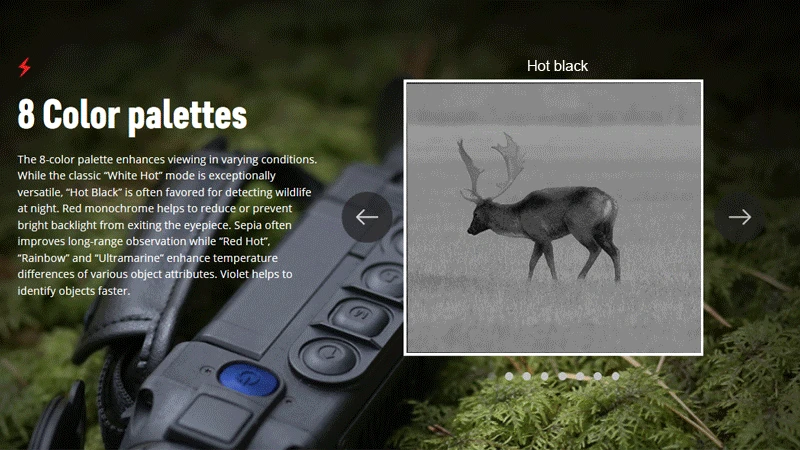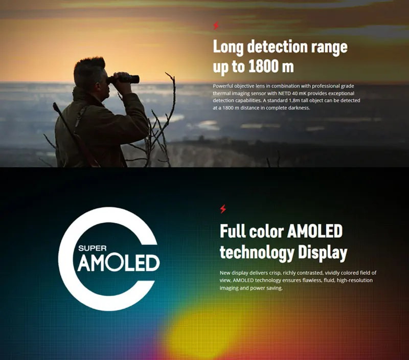 Hochauflösende Abbildung Ein scharfes, einzelner kёrperteile und sogar kleinster Objekte wie Zweige, Blätter, Gras und Bodenoberfläche. Переменная Vergrößerung Вариабельный зум, бис achtfach, bietet einen weiteren Fokus und eine bessere Hohe Bildwechselfrequenz Dank hoher Bildwechselfrequenz (50Hz) ist die des Bewegungen des Beobachters oder des Objektes gewährleistet Große Entdeckungsdistanz Durch das lichtstarke Objektiv und dem Professional Sensor NETD 40 mK sind Objekte mit 1,8m selselbst in abrester Dunkelheit auf eine Entfernung von 1800m entdeckt werden.