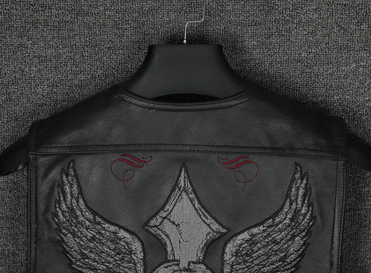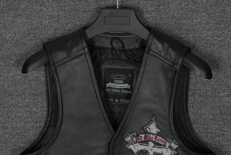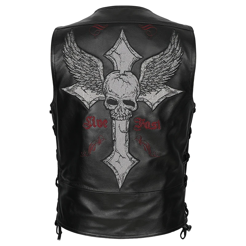 Мужская мотоциклетная Байкерская жилетка из натуральной кожи с боковой шнуровкой, черная жилетка с вышитым черепом из воловьей кожи, куртка без рукавов