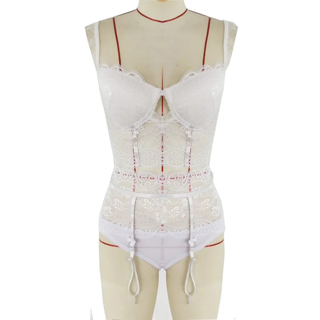 Информация о продукте: Цвет: белый Материал: полиэстер Воротник: v-образный вырез Сезон: весна, лето, осень, зима Стиль: пикантные Стиль Тип: наборы нижнего белья Как стирать: Ручная стирка в холодной воде Место: медовый месяц, свадебная ночь, вечерние белье, ночное белье, День Святого Валентина и т. д. Посылка: 1 комплект нижнего белья Детали: Этот комплект сексуального нижнего белья состоит из ремешков и кружева, что очень особенное и обязательно понравится Этот комплект нижнего белья имеет подвязку, трусики и бюстгальтер, которые можно использовать вместе или отдельно. Кружево очень мягкое и подойдет вашему телу лучше и позволит вам чувствовать себя расслабленным Если вы хотите почувствовать себя более расслабленным, вы можете выбрать большой размер. Рекомендуется ручная стирка при температуре воды 30 градусов.