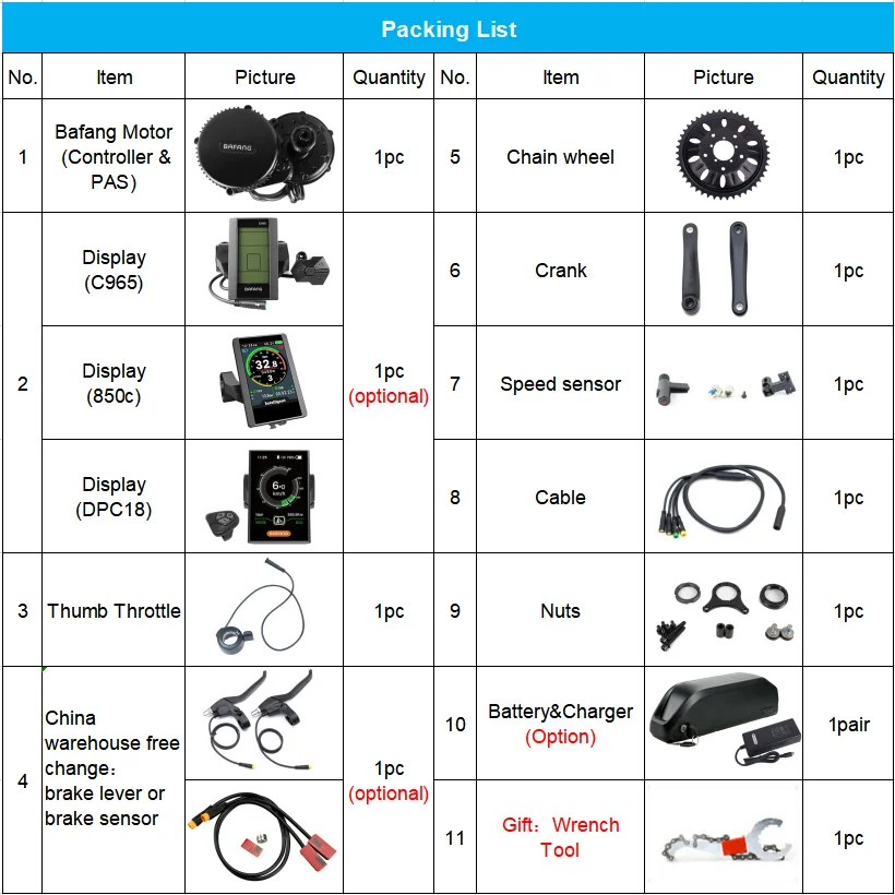 Упаковочный лист для двигателя: 1 комплект * Двигатель со средним приводом, встроенный контроллер 1 пара * тормозные рычаги (можно изменить на Гидравлические Тормозные датчики бесплатно в Китае, опционально) 1 пара * рукоятка 1 пара * цепное кольцо (BBS01,BBS02 44T/46T/48T/52T опционально, 1000W 42T/46T, 46T по умолчанию) 1 комплект * дроссельная заслонка большого пальца 1 комплект * Датчик скорости 1 * дисплей (DPC18, C965 дисплей, 850C, опционально) Кабель 1*4-1 EB-BUS 1 * аксессуары Подарки: 1 * Установочный ключ 1*36V 250W стикер (китайский склад, опционально) Дополнительный товар, указанный выше, пожалуйста, отметьте, когда вы заказываете, если вам нужно или хотите изменить. Упаковочный лист для батареи: 1 * батарея eBike 1 * зарядное устройство 1 * Соединительный кабель для аккумулятора двигателя (интерфейс Anderson & Bullet) 1 * Разъем XT60, пожалуйста, свяжитесь с нами, если он доступен прямо сейчас. Если доставка со склада ЕС, штепсельная вилка зарядного устройства по умолчанию является стандартом ЕС, пожалуйста, обратите на это внимание.