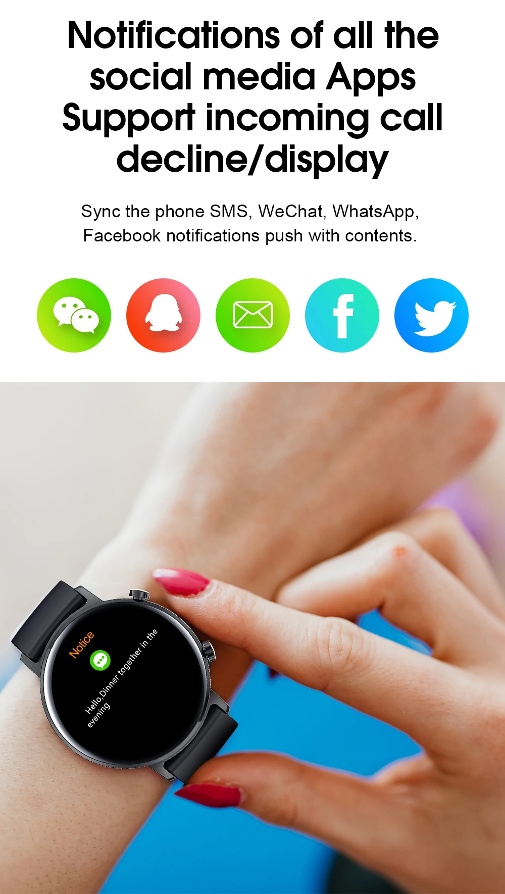 Основные характеристики Пульс, ЭКГ, кровяное давление, кислород, шагомер, секундомер, будильник, управление музыкой, удаленная камера Bluetooth push Звонки, SMS, Wechat, WhatsApp и т. д. синхронизация содержимого дисплей (поддерживает языки для 170 стран и регионов) напоминание о звонках, напоминание о сообщениях, много напоминаний о соцпрограммном обеспечении. Монитор сердечного ритма 24 часа мониторинг сердечного ритма Шагомер Шаги упражнений, сжигание калорий, запись пробега Монитор сна Автоматически включается с 9 до 9. Напоминание о звонке Поддержка снижения вызова Несколько режимов движения Прогулки, бег, плавание, альпинизм, Велоспорт, футбол, баскетбол, настольный теннис, бадминтон и т. д. Напоминание о сидячем положении Вы можете установить время, чтобы напомнить себе о том, что стоите. Найдите свой телефон Нажмите на него и телефон предупредит о мелодии звонка. Яркий экран запястья Установите его в приложении, это займет больше энергии, когда он включен.