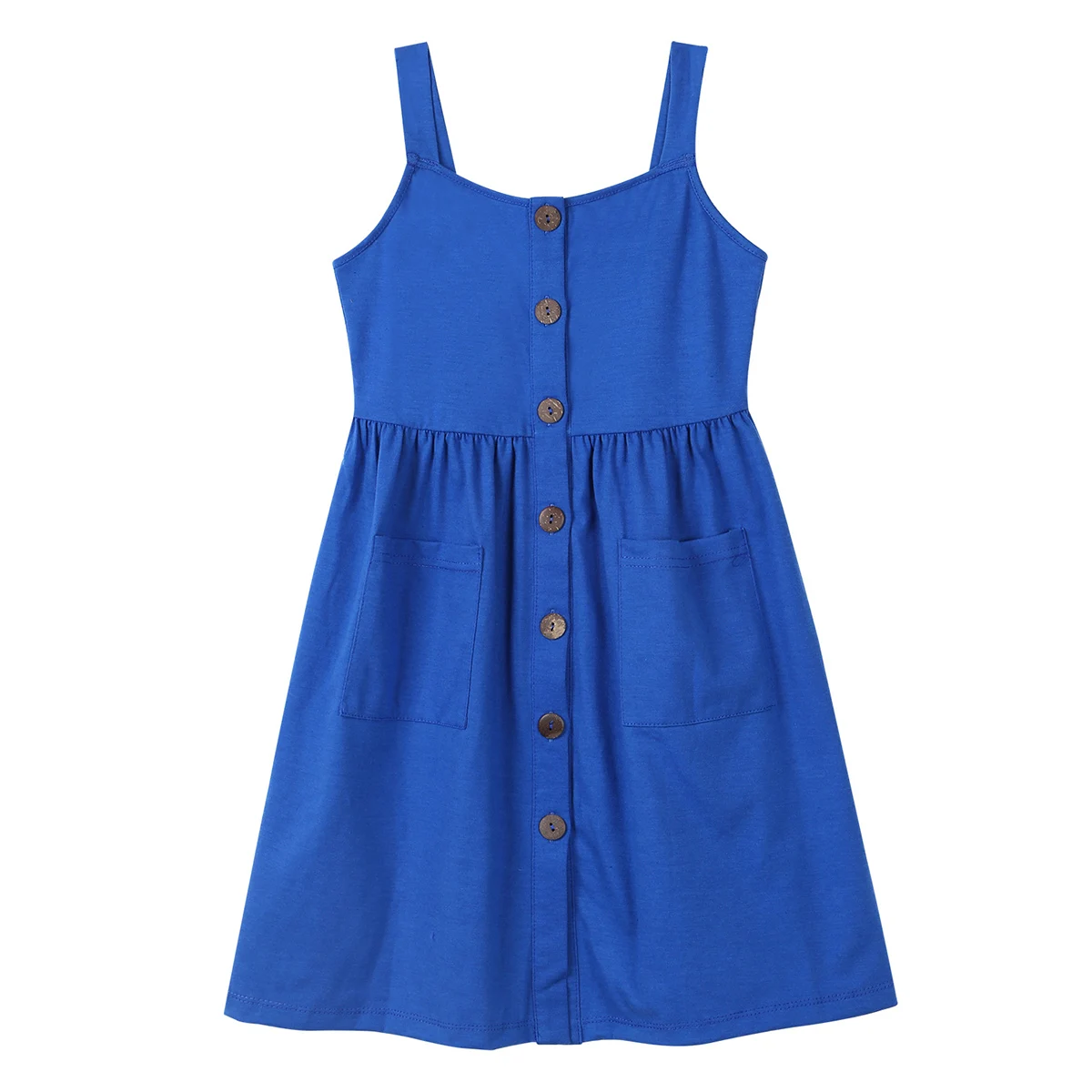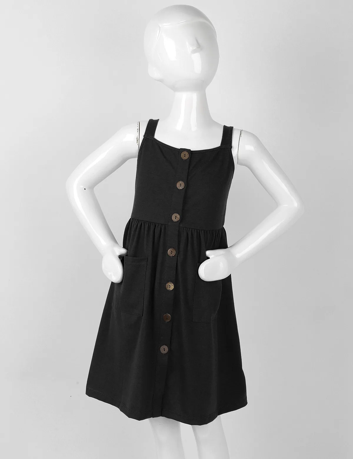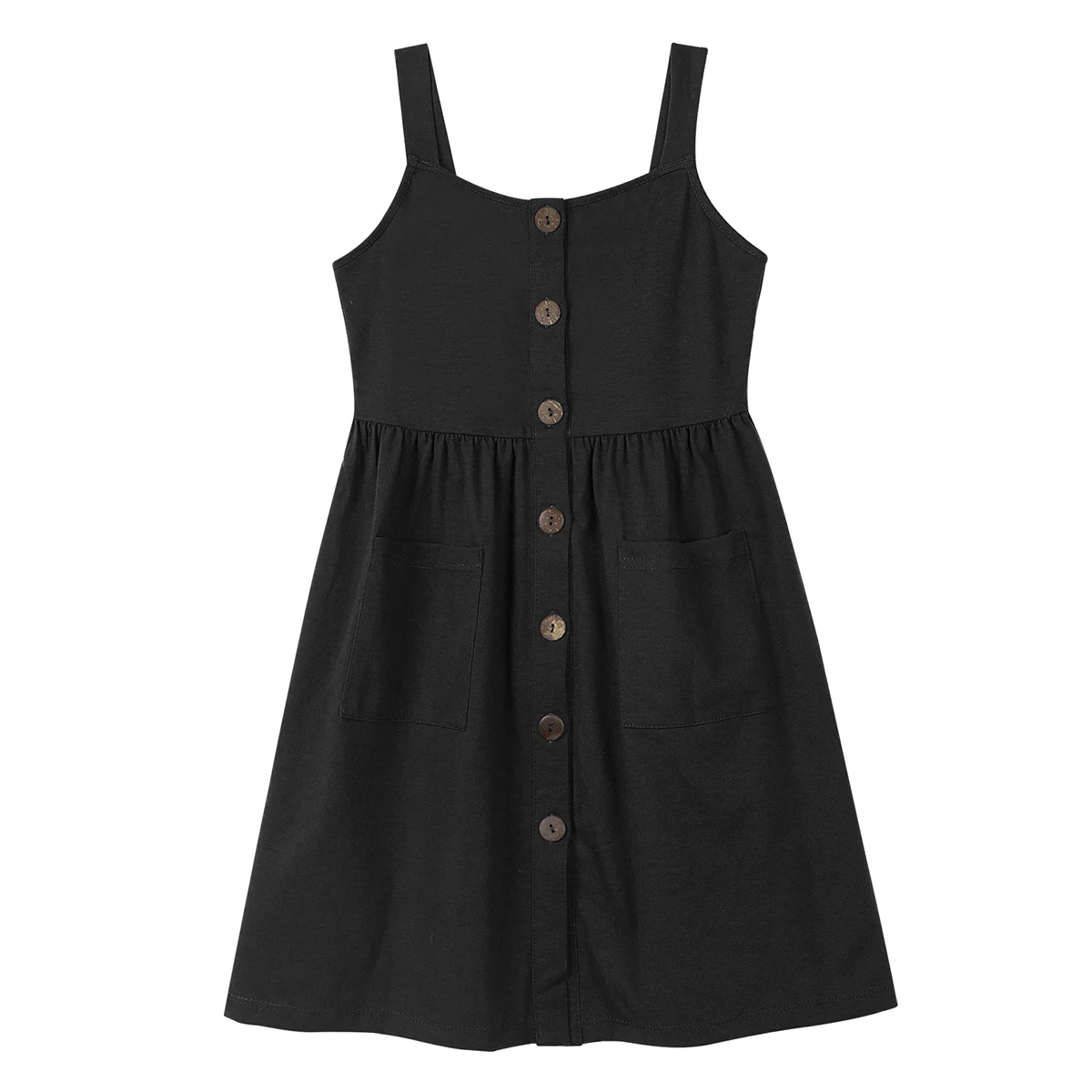 Бретельки-спагетти, квадратный вырез, застежка на пуговицах и два кармана спереди.