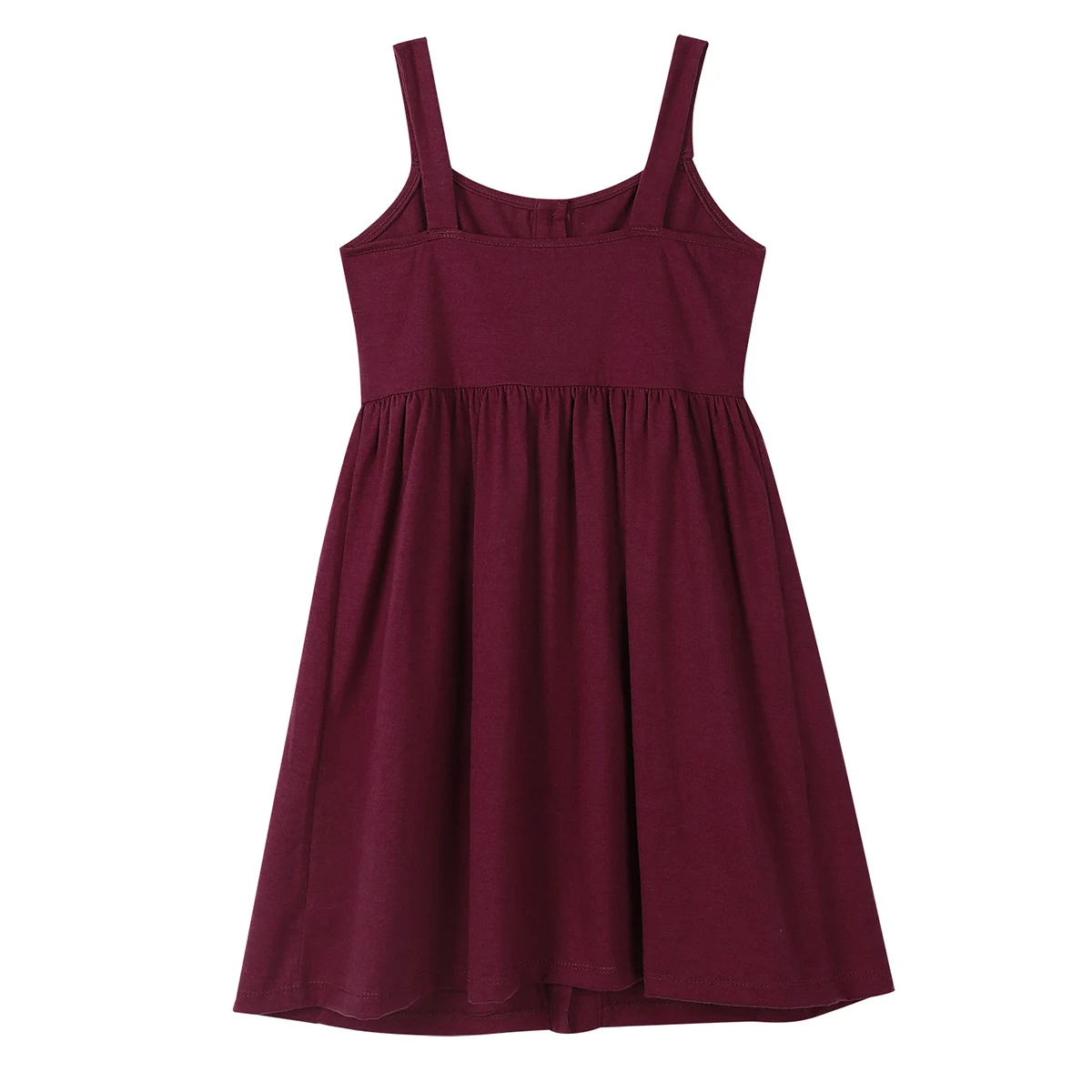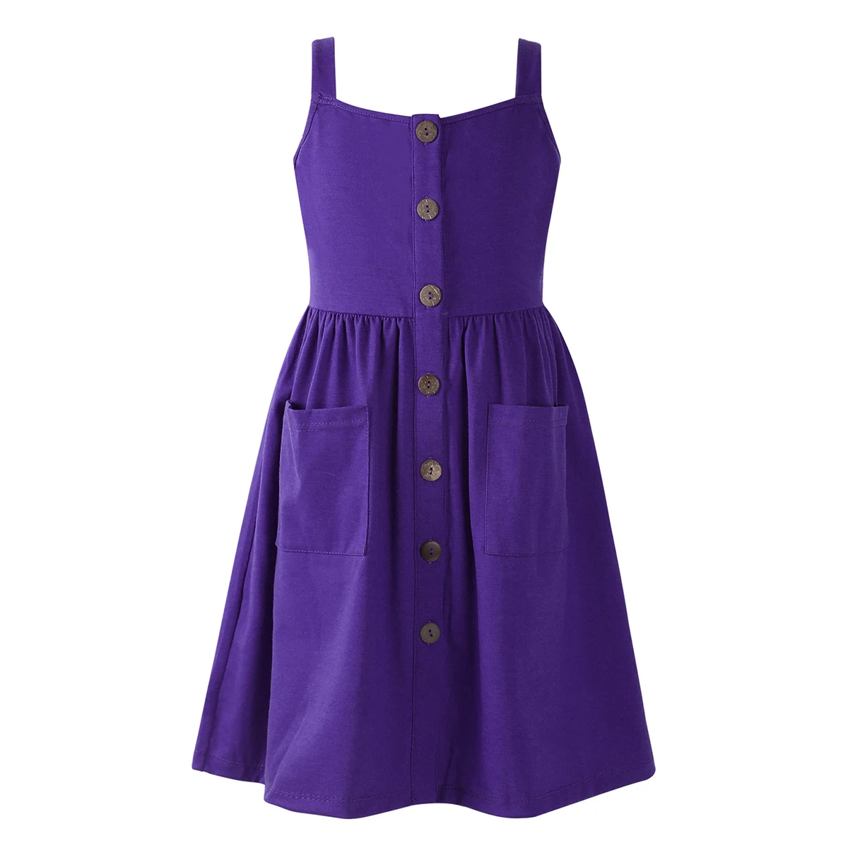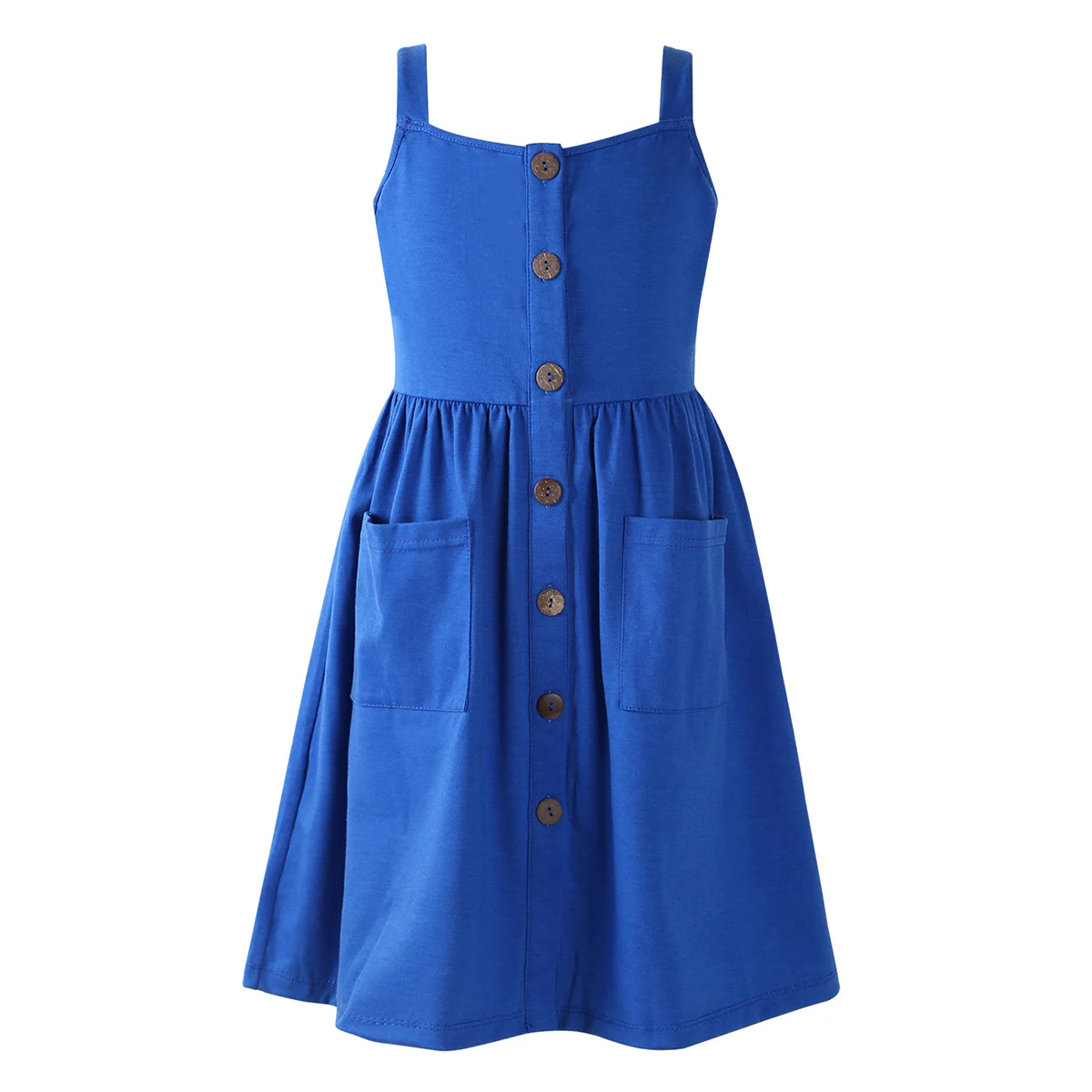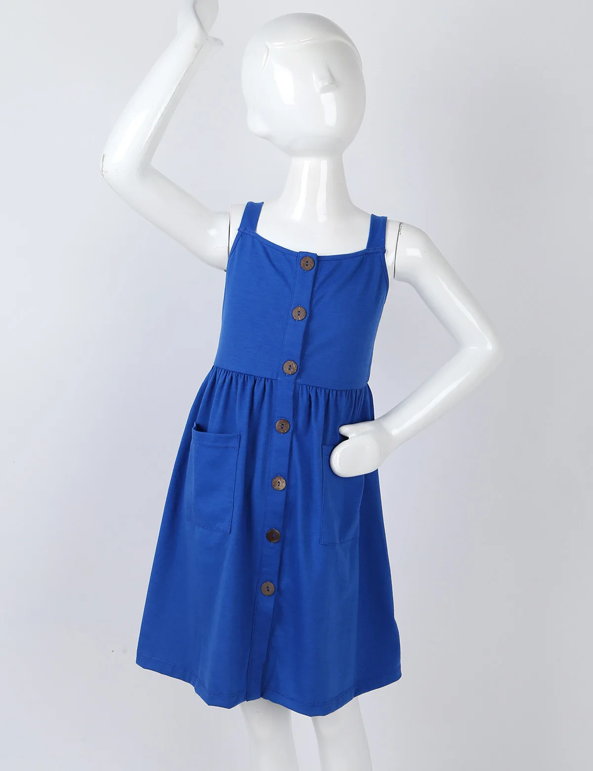Бретельки-спагетти, квадратный вырез, застежка на пуговицах и два кармана спереди.