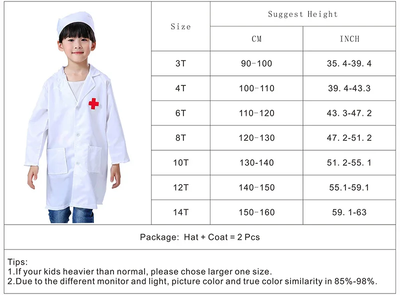 ★Материал: полиэстер★Посылка: 1 шт. пальто с красным крестом, 1 шт. шляпа★Размер: 3T/4T/6T/8T/10T/12T/14T, подходит для детей 3-14 лет★Длина рукава: длинный рукав★Стиль: униформа для ролевых игр для медсестры