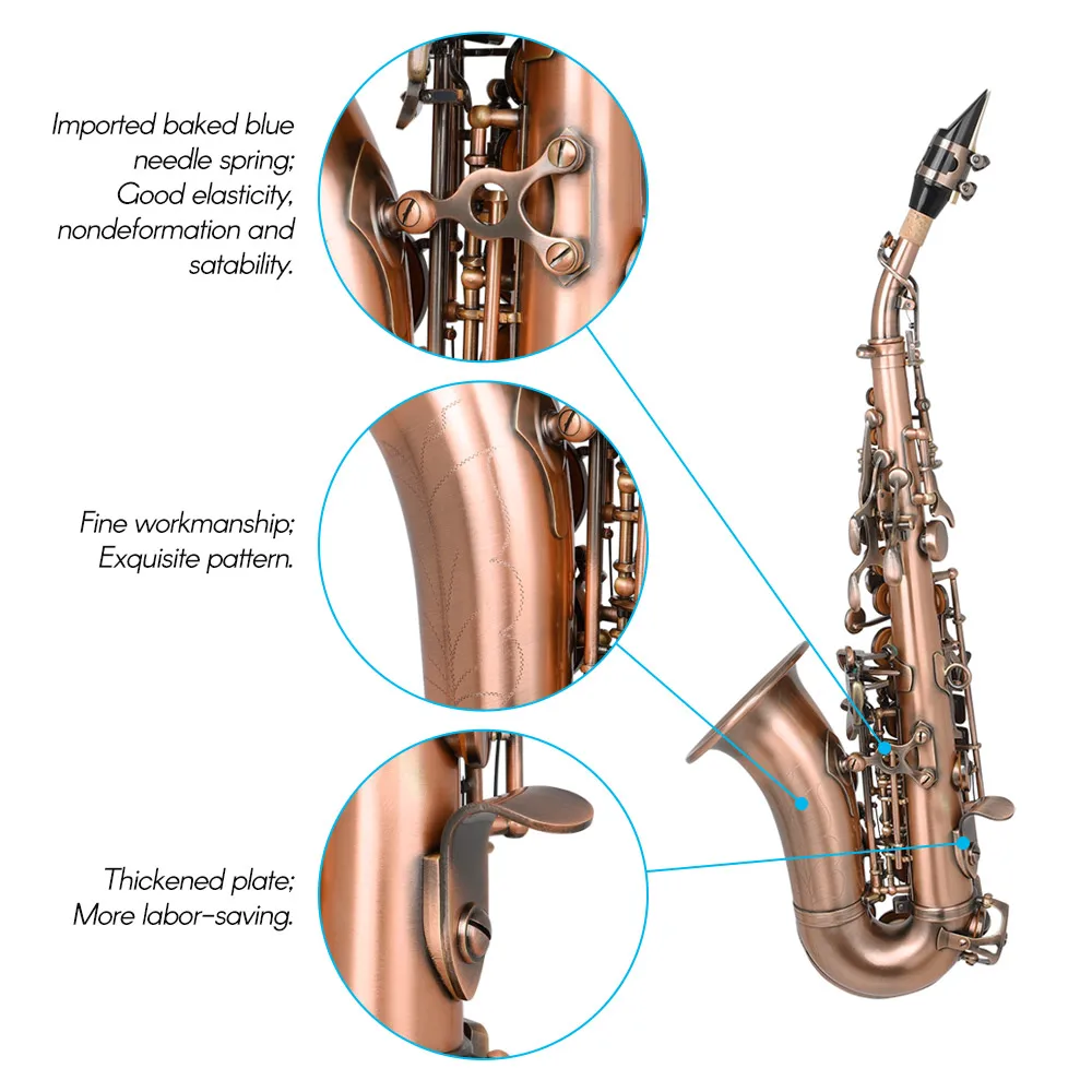 Латунный корпус саксофона с бронзовой поверхностью в винтажном стиле вырезан вручную с тонким мастерством и изысканным рисунком без каких-либо дефектов.