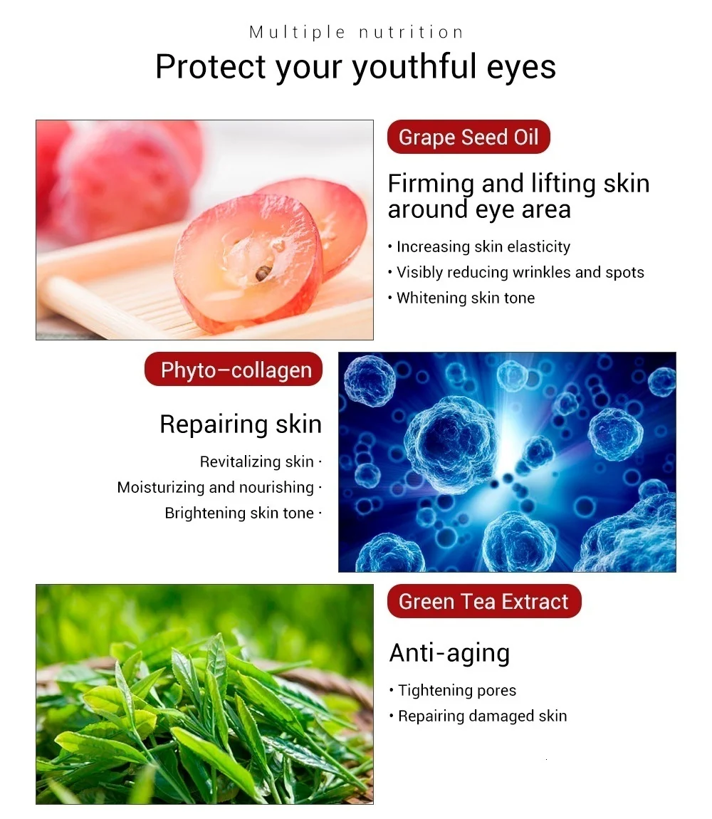 1. Виноградные косточки, укрепляющие и поднимающие кожу вокруг области вокруг глаз Повышение упругости кожи✔ Заметное уменьшение морщин и пятен✔ Отбеливающий кожу тон✔ 2. Фито-коллагеновый Восстанавливающий кожу Восстанавливающий кожу✔ Увлажняющий и питательный✔ Осветляющий тон кожи✔ 3. Экстракт зеленого чая-Антивозрастной Подтяжки кожи поры✔ Восстановления поврежденной кожи✔