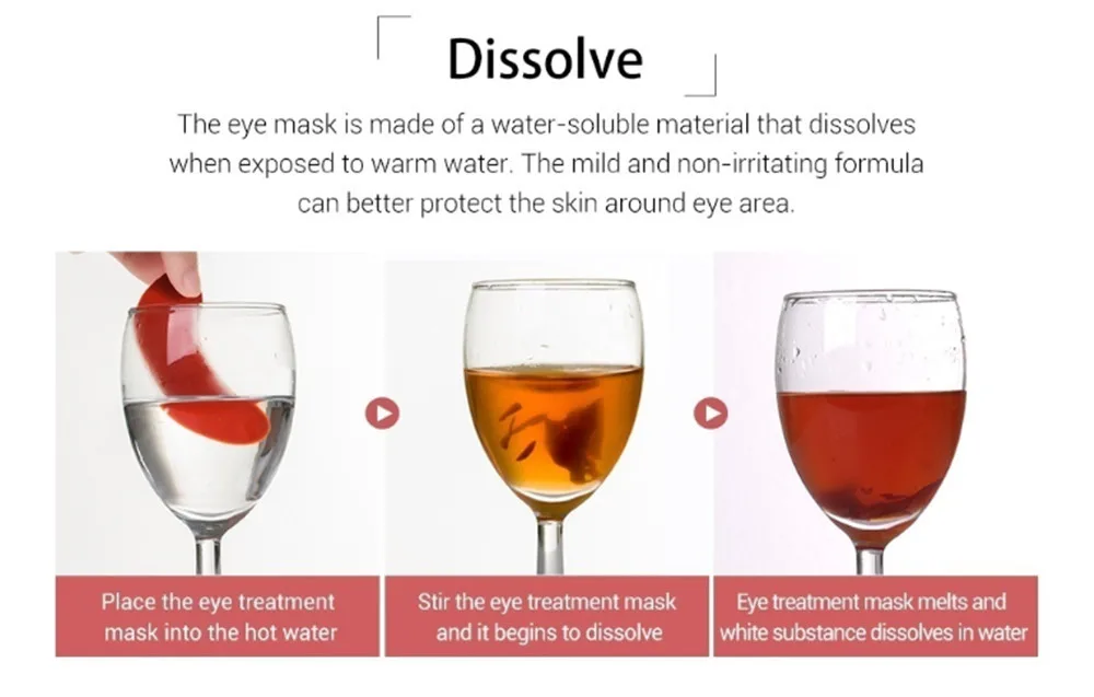 Есть три основных преимущества коллагеновой маски для глаз 1. Витамин Е Он может прочно закрепить. Достаточно увлажняет кожу и эффективно улучшает внешний вид темных кругов и тонких линий. 2. Растворите Маска для глаз изготовлена из водорастворимого материала, который растворяется при воздействии теплой воды. Мягкая и не раздражающая формула лучше защищает кожу вокруг глаз. 3. В наличии тоньше При нанесении он постепенно становится тонким и питательные вещества быстро впитываются в кожу. ▶Быстрый поглощения питательных веществ ▶Через 15- 20 минут маска становится тонкой