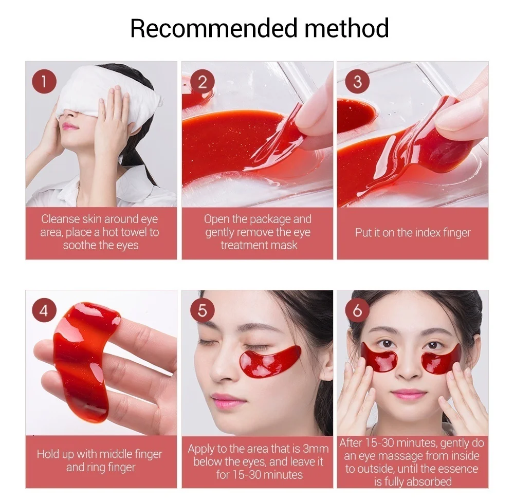 1. Очистите кожу вокруг области вокруг глаз, поместите горячее полотенце, чтобы успокоить глаза; 2. Откройте посылка и аккуратно снимите маску для лечения глаз; 3. Положите его на указательный палец; 4. Удерживайте средний палец и безымянный палец; 5. Нанесите на область, которая находится на 3 мм ниже глаз, и оставьте на 15- 30 минут; 6. После 15-30 минут, аккуратно сделайте массаж глаз изнутри и снаружи, пока эссенция полностью не впитывается.