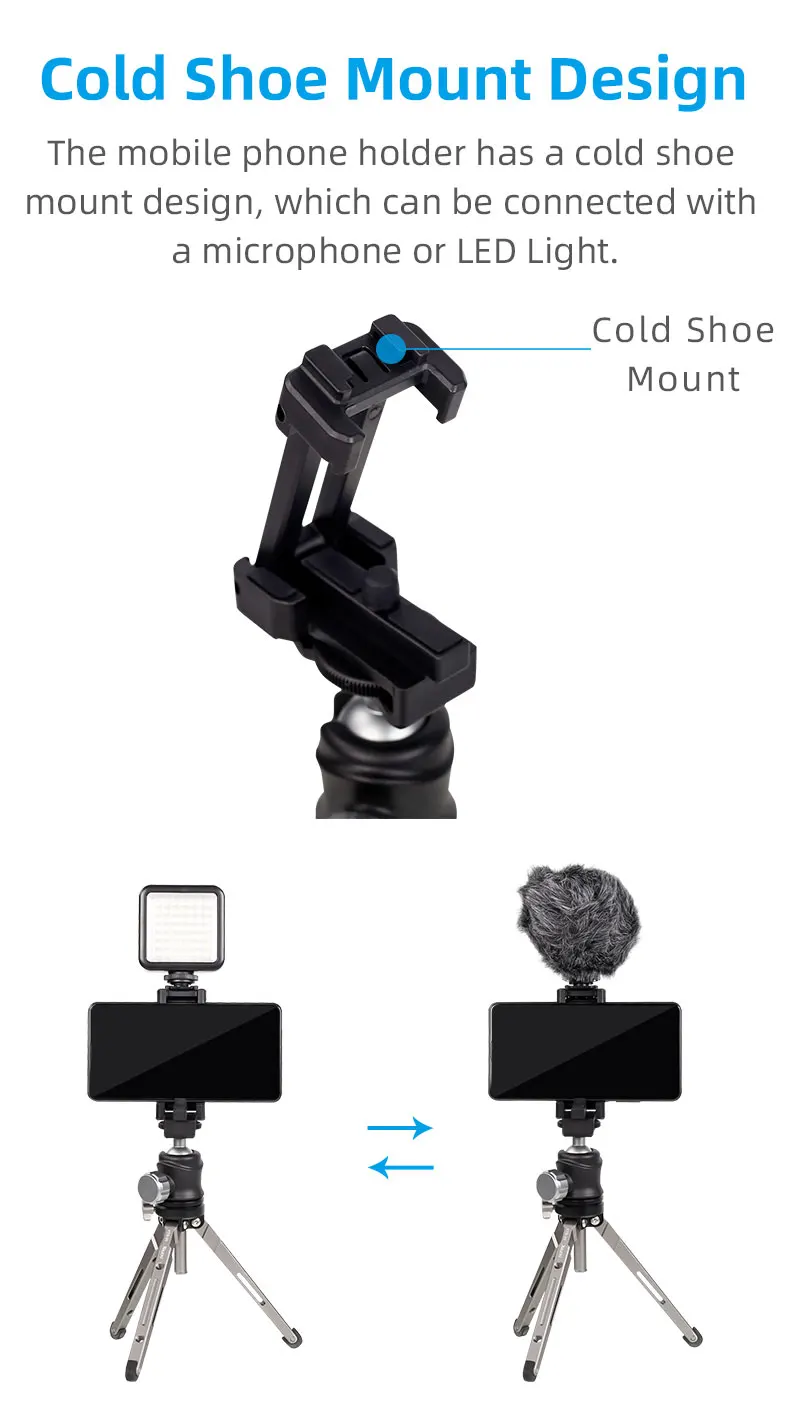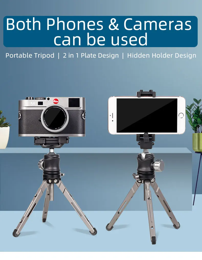 1,2 в 1 дизайн шаровой головки: вы можете установить камеру непосредственно на верхней части головки штатива. Когда вы разворачиваете пластину, пластина становится держателем телефона, и вы можете установить любой тип мобильный телефон (Телескопическая Длина держателя на мобильный телефон: 58 ~ 83 мм) 2. Более стабильная и прочная: Эта столешница для штатива изготовлена из высококачественного алюминиевого сплава, с противоскользящими резиновыми стельками и отверстиями для галстука на каждой ноге, это позволяет прикрепить его к другому предмету для повышения стабильности. 3. Универсальная совместимость: характеристики с универсальным винтом 1/4 ″ сверху, широко подходит для dslr/slr и беззеркальных камер, спортивных камер, смартфонов, шарнирных ручек, селфи-палок, моноподов 4. Больше углов: каждая ножка может быть заблокирована и разблокирована шестигранным гаечным ключом, что вы можете снимать под любым углом, как вам нравится-портативный и простой в использовании. 5. Держатель телефона имеет дизайн крепления для холодной обуви, вы можете установить светильник для заполнения микрофона и другое оборудование; Штатив имеет Нижний кронштейн. Вы можете поднять Нижний кронштейн для увеличения высоты штатива; Каждая ножка штатива имеет два стандартных винтовых отверстия 1/4. Вы можете расширить его для удовлетворения потребностей съемки.
