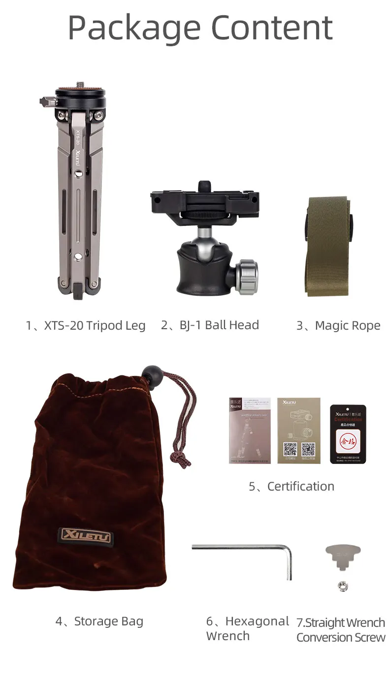 1.XTS-20 штатив 2.BJ-1 шаровой головкой 3. Волшебные веревочки 4. Сумка для хранения 6. Шестигранный ключ, дюймовый стандарт 7. Прямой ключ и конверсионный винт