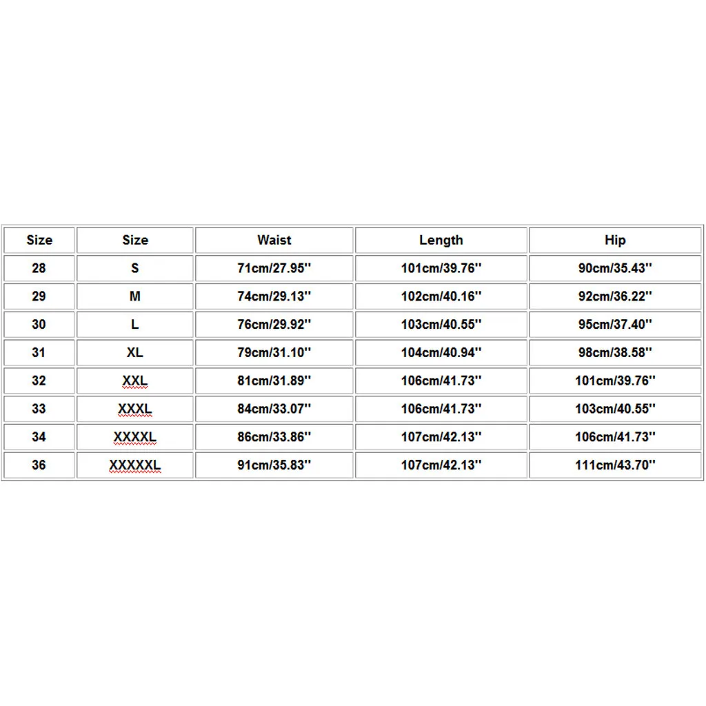 Что вы получаете: 1 x Мужские штаны Размеры Размеры Обхват талии Длина Обхват бедер 28 S 71 см/27,95'' 101 см/39,76'' 90 см/35,43'' 29 М 74 см/29,13'' 102 см/40,16'' 92 см/36,22'' 30 L 76 см/29,92'' 103 см/40,55'' 95 см/37,40'' 31 XL 79 см/31,10'' 104 см/40,94'' 98 см/38,58'' 32 XXL 81 см/31,89'' 106 см/41,73'' 101 см/39,76'' 33 XХХL 84 см/33,07'' 106 см/41,73'' 103 см/40,55'' 34 XXXXL 86 см/33,86'' 107 см/42,13'' 106 см/41,73'' 36 XXXXXL 91 см/35,83'' 107 см/42,13'' 111 см/43,70''