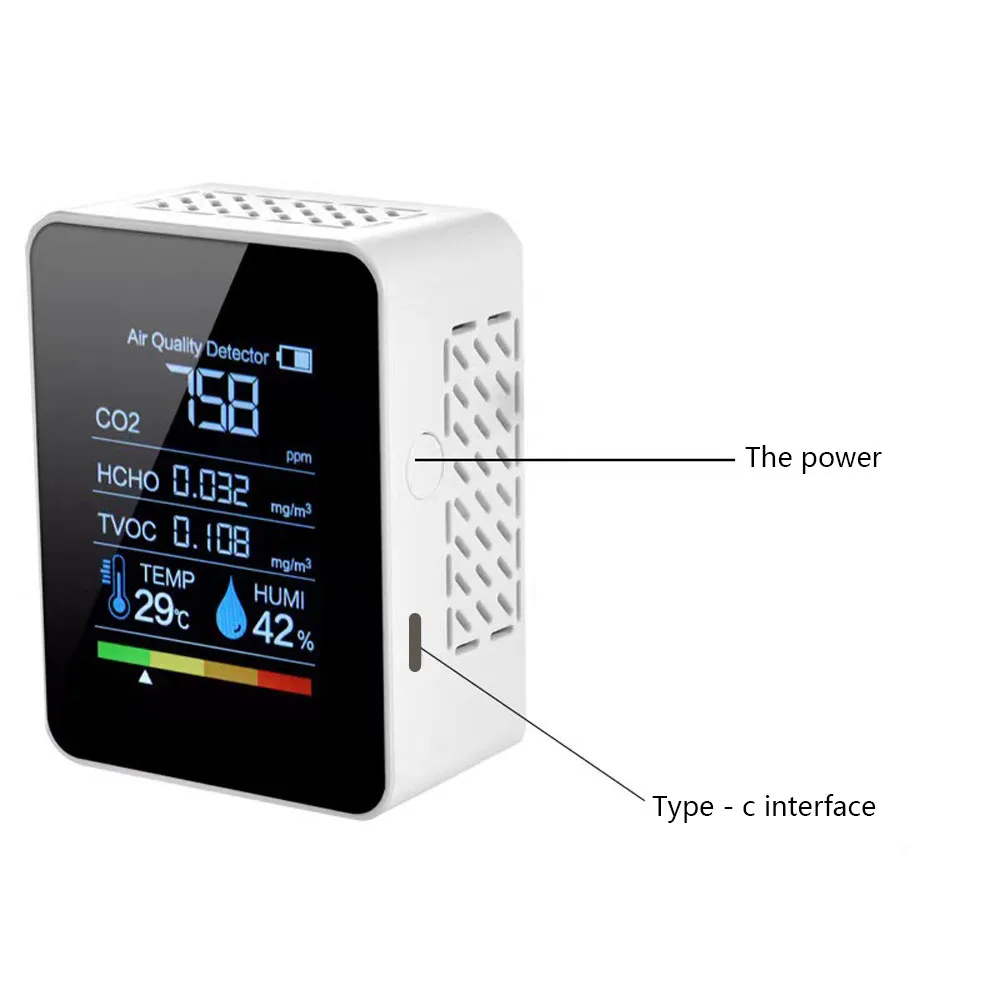 5в1: большой экран отображает мощность, значение CO2, значение TVOC, значение HCHO, температуру и влажность.