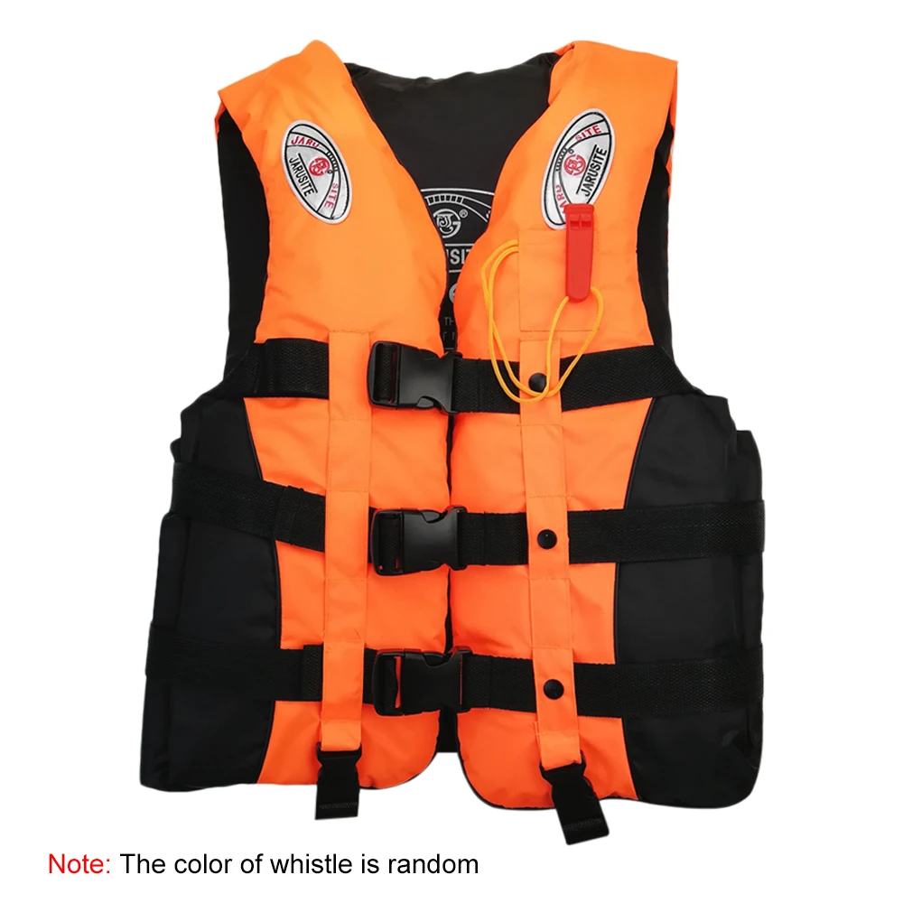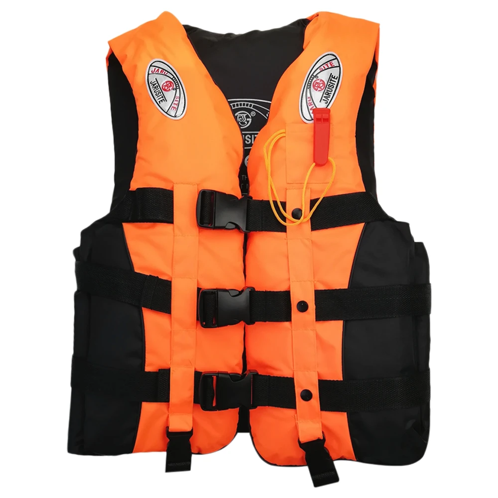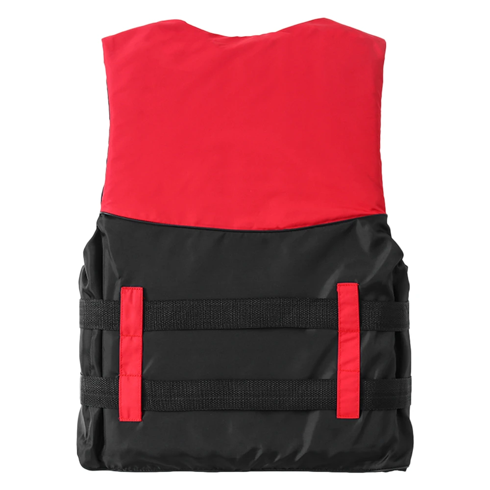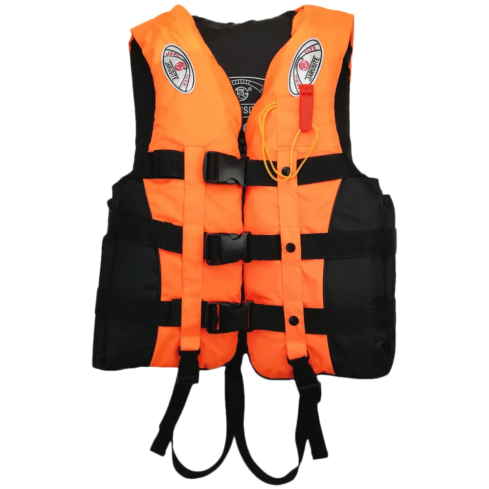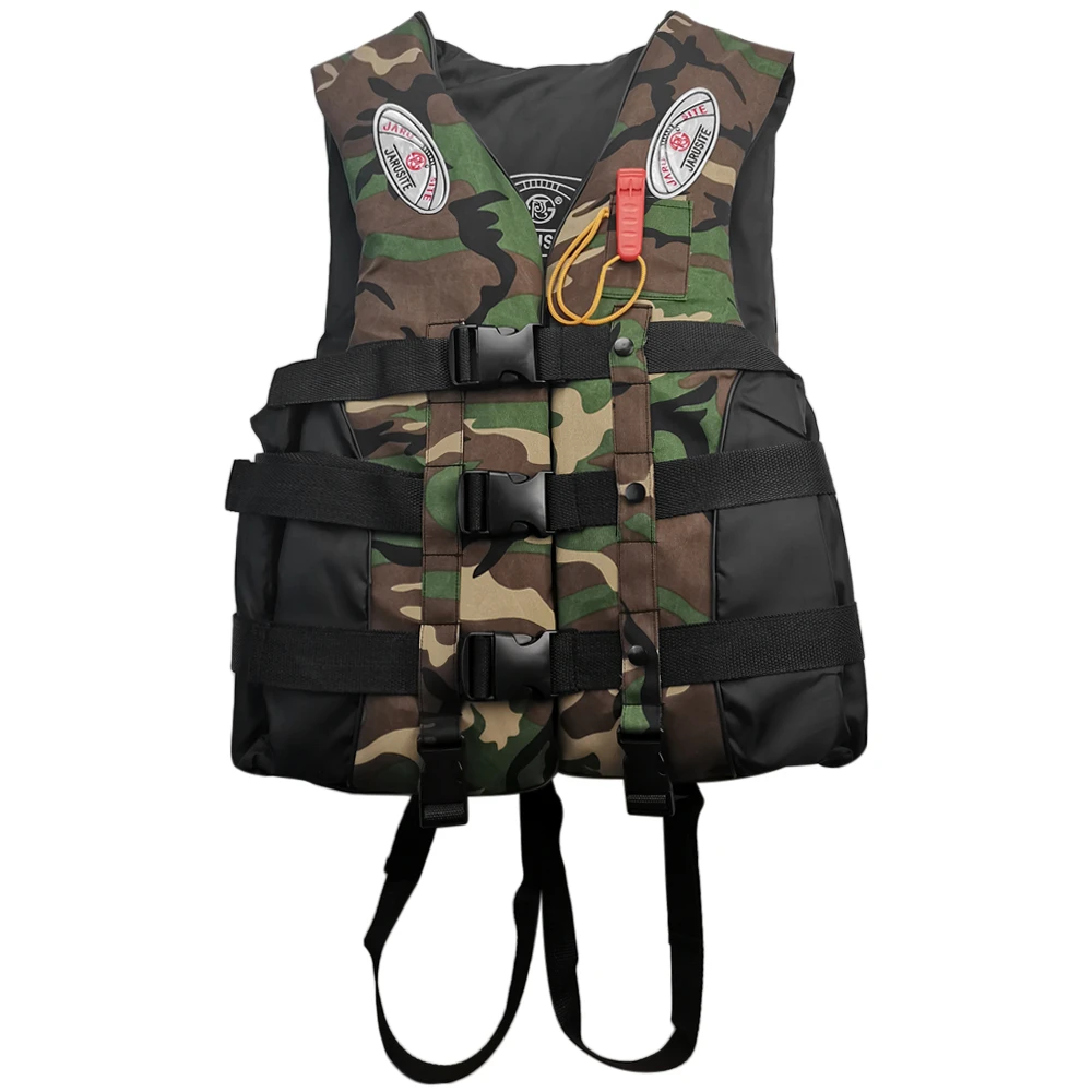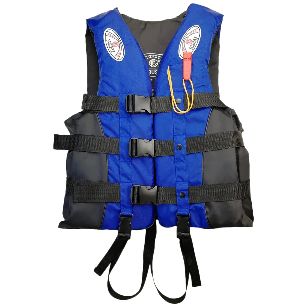 Три строчные пряжки и регулируемые ремни для ног, чтобы плотно соединить спасательный жилет с вами.